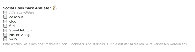 Um den Verweis auf eine Seiten direkt bei einem der verfügbaren Anbieter speicherbar zu machen, legt man innerhalb eines Artikels ein Inhaltselement mit dem Namen **Social Bookmarks (Soziale Lesezeichen)** an. Dort wählt man unter Social Bookmark Anbieter die bevorzugten Anbieter aus und/oder aktiviert die Unterstützung für den AddThis Meta-Anbieter.