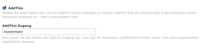 Wenn man sich für AddThis als Anbieter entscheidet, muss man einen AddThis-Benutzernamen angeben, die Einbindung in AddThis-Seiten für statistische Zwecke die Angabe eines Benutzers erwartet. Das AddThis-Logo wird automatisch in der aktuellen Frontend-Sprache angezeigt.