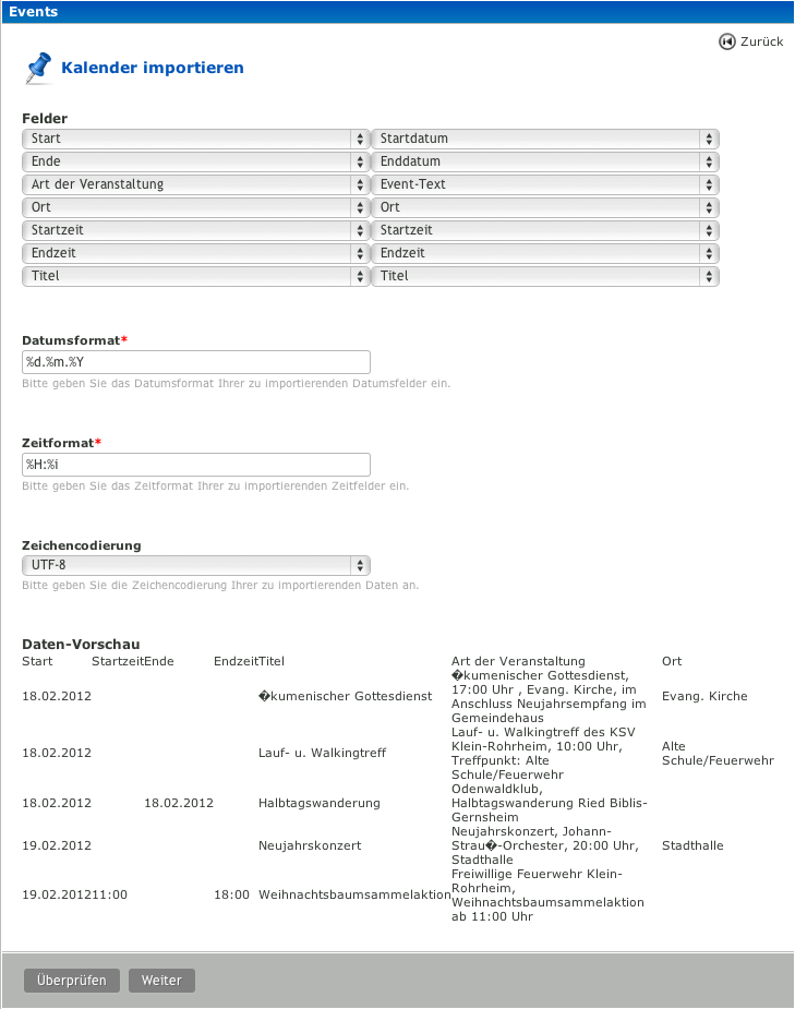 - Im Feld Datumsformat muss ein Ausdruck zum Ermitteln des verwendeten Datumsformates angegeben werden, damit Contao beim Import des Start- oder Enddatums das Datum auch wirklich erkennt. Gültige Formatangaben sind alle Angaben, die auch in der PHP-Funktion strftime verwendet werden können.
