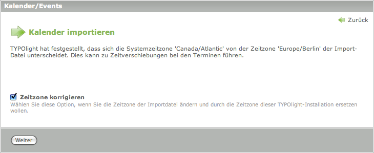 Wenn man eine iCal-Datei importierz, die eine andere Zeitzone hat als die des Contao-Systems, so erhält man einen Warnhinweis, der auf diesen Umstand aufmerksam macht. Man hat außerdem die Möglichkeit, durch die Auswahl eines Kontrollkästchens die Zeitzone der Importdatei auf die Zeitzone des Contao-Systems zu setzen, wenn man vermutet, dass die Termine eigentlich mit der identischen Zeitzone des Contao-Systems hätten erstellt werden sollen (was z.B. bei einer versehentlich "falschen" Zeitzonen-Einstellung des Contao-Systems oder des externen Kalender-Programms der Fall sein kann). Wenn man das Kontrollkästchen nicht auswählt, werden die Termine entsprechend der im externen Kalenderprogramm verwendeten Zeitzone in Contao importiert. Dabei wird es in den meisten Fällen zu einer Zeitverschiebung bei den importierten Terminen kommen, da diese nun in der in Contao voreingestellten Zeitzone angezeigt werden.