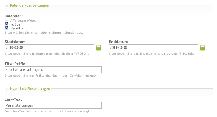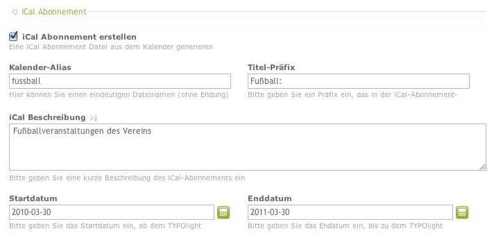 Neben einem Zeitraum, innerhalb dessen Termine aus den ausgewählten Contao-Kalendern extrahiert werden, kann man eine Beschreibung für den Kalender angeben, die beim Abonnieren in externen Kalenderprogrammen, wie z.B. Apple iCal oder Microsoft Outlook angezeigt wird. Im Feld Titel-Präfix hat man die Möglichkeit, den Titeln aller Termine eine bestimmte Zeichenkette voranzustellen.
