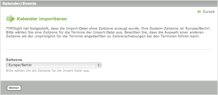 Wenn man eine iCal-Datei importiert, der die Angabe einer Zeitzone fehlt (was z.B. bei iCal-Dateien der Fall ist, die aus Microsoft Outlook Versionen bis Microsoft Office 2003 exportiert werden), so fordert Contao einem auf, eine Zeitzone für die Importdatei anzugeben. Dabei sollte man nach Möglichkeit die Zeitzone auswählen, die bei der Erstellung der Termine verwendet wurde, weil es ansonsten zu unbeabsichtigten Zeitverschiebungen kommen kann.