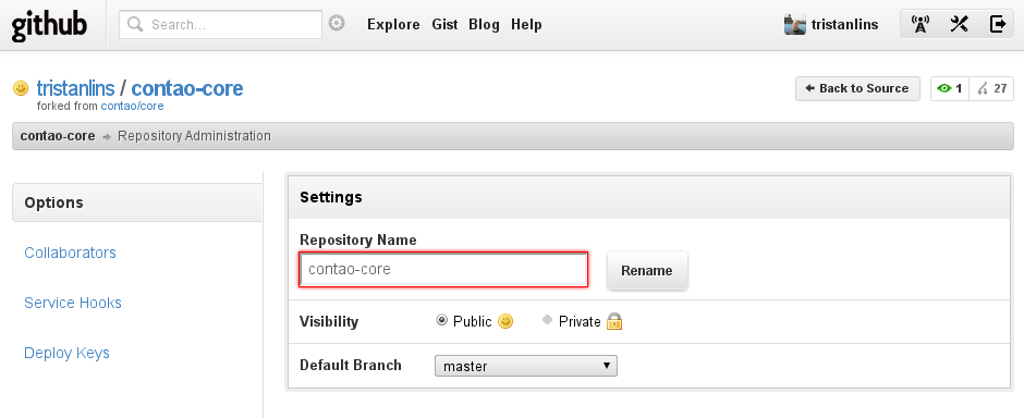 Standardmäßig wird der Fork unter dem Namen core erstellt. core kann vieles bedeuten, daher empfiehlt es sich, das Repository sinnvoll umzubenennen. Z.B. in contao-core. Dazu muss zuerst auf den Button Admin geklickt werden, im darauffolgenden Formular lässt sich der Name des Repositories ändern.