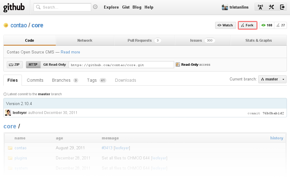 Zuerst muss ein persönlicher Fork erstellt werden. Ein Fork ist eine Kopie des Repositories, im eigenen Account. Auf dem Fork kann man beliebig arbeiten, man hat alle Commits die bis zu dem Zeitpunkt gemacht wurden zur Verfügung und kann mit diesen Arbeiten wie es einem beliebt. Um einen persönlichen Fork zu erstellen, muss zuerst das Contao Repository auf github aufgerufen werden. Anschließen reicht ein klick auf den Button Fork um einen persönlichen Fork zu erstellen. Nachdem der Vorgang abgeschlossen ist, wird man direkt auf seinen persönlichen Fork weitergeleitet.