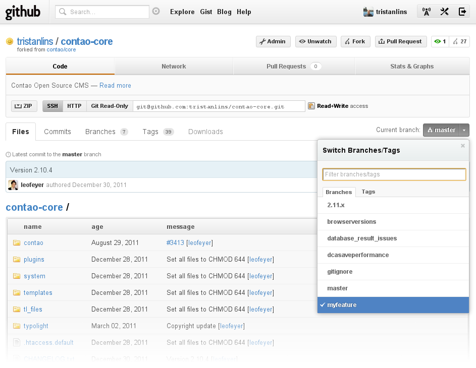 Der neue Fork besteht standardmäßig aus den gleichen Branches wie das Contao Repository. Um im persönlichen Fork den Überblick nicht zu verlieren, vor allem wenn man mehrere Features parallel entwickeln will, sollte jedes Feature in einem eigenen Branch entwickelt werden. Ein neuer Feature-Branch sollte immer auf einen Branch aus contao/* aufgebaut werden. Dadurch wird das Feature immer auf dem aktuellen Stand entwickelt und kann so von den Contao Entwicklern automatisiert in den Core überführt werden.