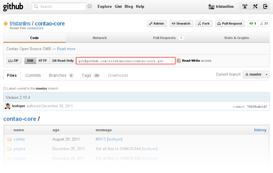 $ git clone git@github.com:tristanlins/contao-core.git Cloning into contao-core... remote: Counting objects: 27464, done. remote: Compressing objects: 100% (6952/6952), done. remote: Total 27464 (delta 20159), reused 27310 (delta 20025) Receiving objects: 100% (27464/27464), 17.49 MiB | 152 KiB/s, done. Resolving deltas: 100% (20159/20159), done.