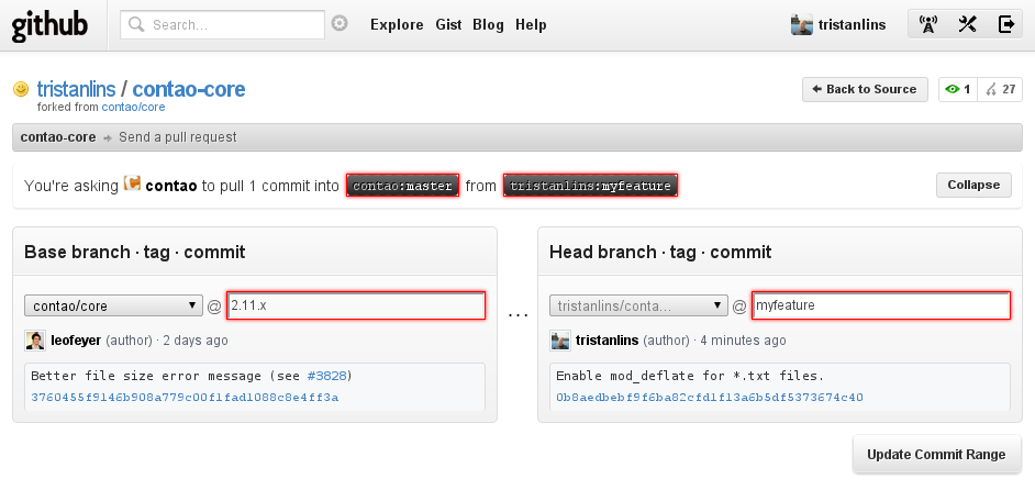 Wichtig ist, dass man genau ausgewählt hat, für welchen Branch im Core Repository der Pull Request bestimmt ist und welchen eigenen Branch man pullen möchte. Die Auswahl der Commit Range erhält man, wenn man auf den Button Change Commits klickt.