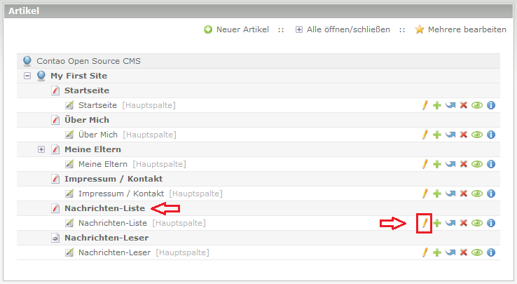 Zuerst wechselt man im Backend über Inhalte zu Artikel und sucht den Artikel der Seite Nachrichten-Liste. Dort klickt man auf das Bearbeiten-Symbol.