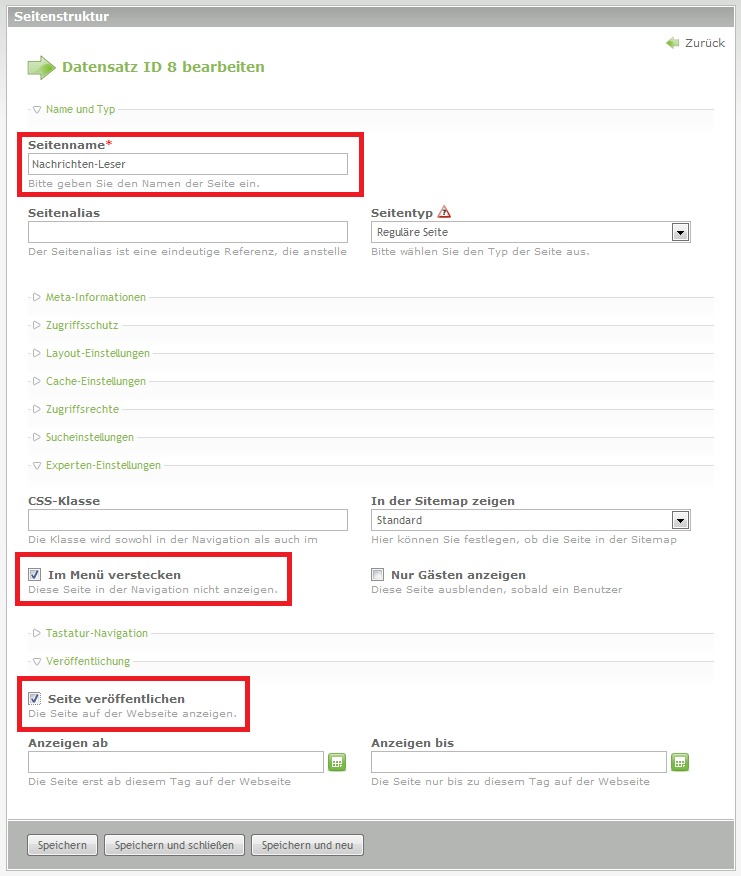 Wichtig: Da man die einzelnen Nachrichten nicht direkt über das Menü öffnen kann, sondern nur von einer Nachrichten-Liste aus darauf weitergeleitet werden kann, wäre es sinnlos, wenn diese Seite im Menü angezeigt wird. Deswegen wird diese Seite im Menü versteckt. Um die Seite im Menü zu verstecken, setzt man in der Rubrik Experten Einstellungen einen Haken beim Punkt Im Menü verstecken.