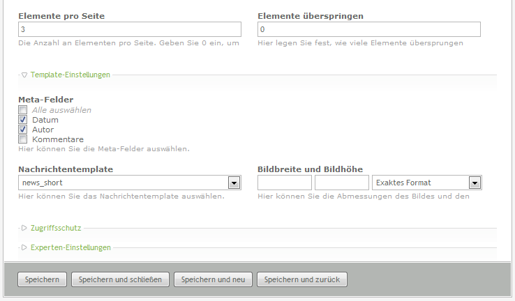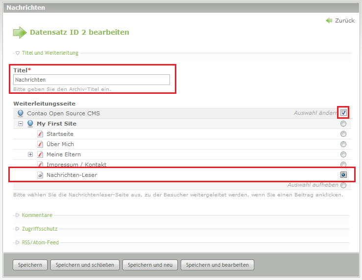 Unter Weiterleitungsseite definiert man die Seite, zu der weitergeleitet werden soll, wenn ein Besucher auf einen Nachrichten-Beitrag klickt. Dafür wurde die Seite Nachrichten-Leser erstellt. In dieser Anleitung werden Kommentare, Zugriffsschutz und RSS nicht benutzt. Abschliessend speichert und schliesst man die vorgenommenen Einstellungen.