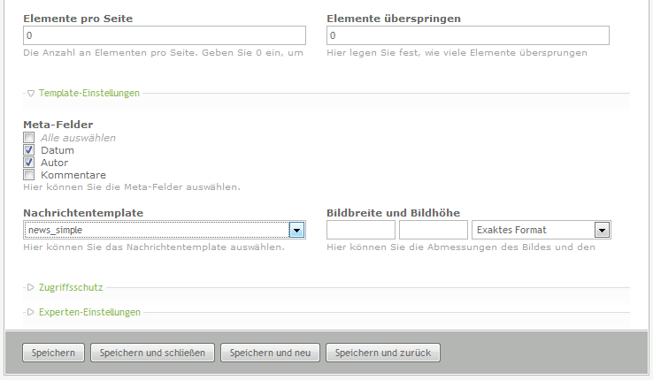 Die Art, wie die Nachrichtenliste aussieht, kann im Template definiert werden. Contao bringt von Haus aus 4 verschiedene Templates mit, aus denen gewählt werden kann. Die geschieht im Abschnitt Template-Einstellungen. Da die Nachrichten laut Aufgabenliste in Kurzform dargestellt werden sollen, wählt man das Template news_simple.
