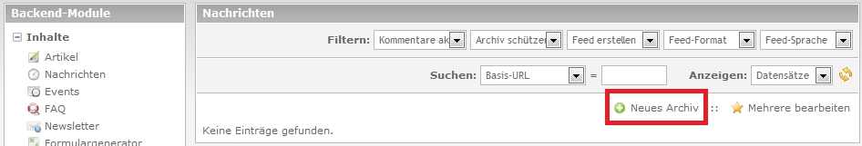 Im nächsten Schritt muss ein Nachrichten-Archiv erstellt werden. Dazu wechselt man im Backend unter Inhalte in das Nachrichten-Modul und klickt auf Neues Archiv.