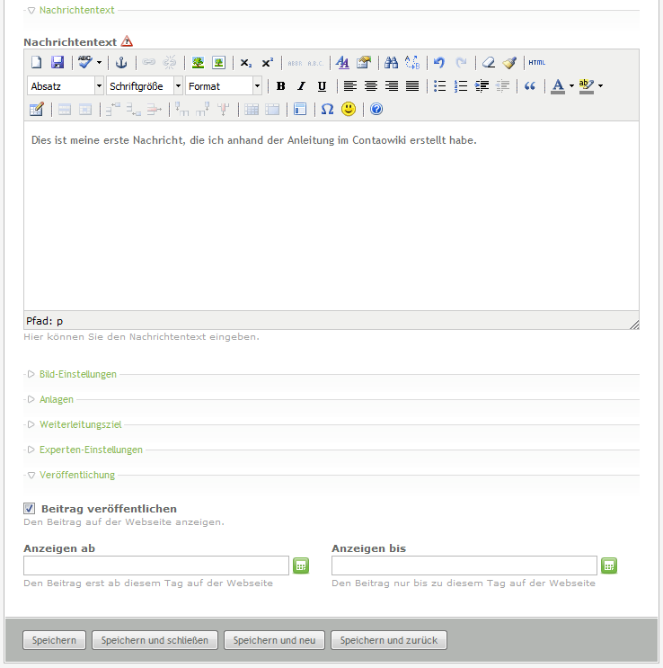 • Beitrag veröffentlichen: Hier wird eingestellt, ob die Nachricht veröffentlicht werden soll oder nicht.