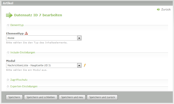 Nachdem die Einstellungen für diesen Modultyp geladen worden sind, wählt man unter dem Bereich Include-Einstellungen in der Einstellung Modul das Modul NachrichtenListe - Hauptseite.