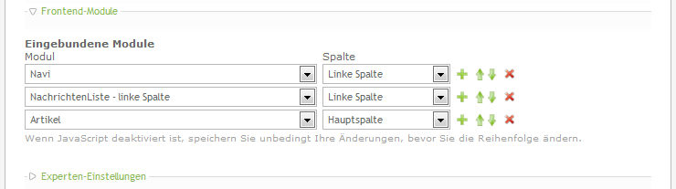 Das Nachrichten-Liste für die linke Spalte der Webseite wird über das Layout eingebunden. Da man im Titel des Modules einen aussagekräftigen Namen vergeben hat, ist es einfach, das richtige der beiden Listenmodule zu wählen.