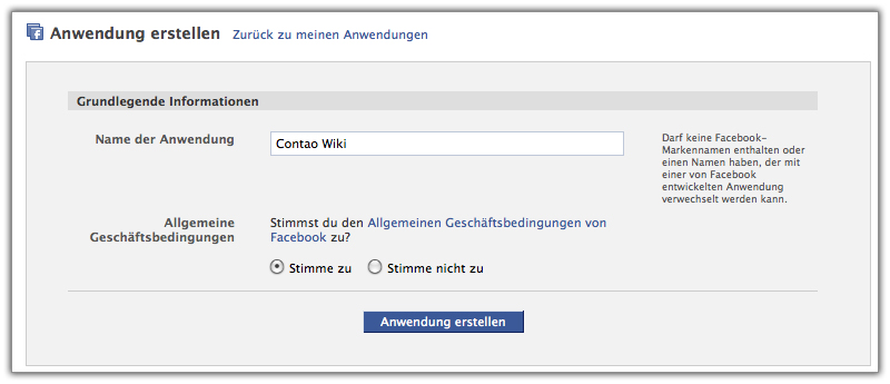 Zuerst muss auf Facebook eine sog. Facebook App erstellt werden - diese kann man, sofern man sich als "Entwickler" bestätigt hat (kann via SMS vorgenommen werden), mit seinem Facebook Benutzerprofil erstellen.