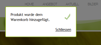 Zum Anzeigen einer HTML-Messagebox nach dem erfolgreichen Hinzufügen eines Artikels in den Warenkorb wird PHP, Javascript und CSS verwendet. Schlussendlich würde es diese Technik auch erlauben Isotope Fehlermeldungen (Out of Stock, komplexere Validierungsresultate) anzuzeigen.
