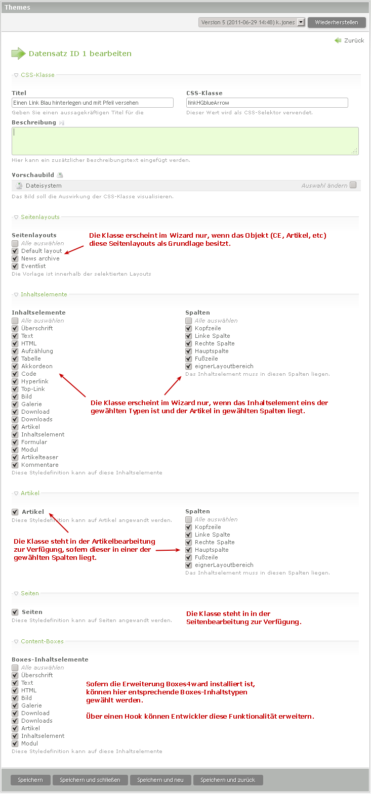 Die verfügbaren Klassennamen müssen zuvor im Theme als Vorlage eingetragen werden.