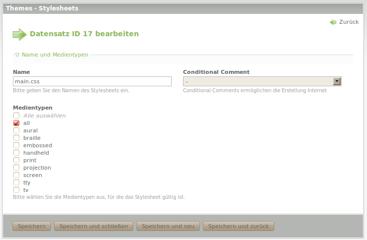 Nun wird die CSS angelegt, bleibt aber vorerst noch leer. Sie bekommt nur einen Namen und anschließend wird ihr mitgeteilt, dass sie für alle Medientypen gelten soll.