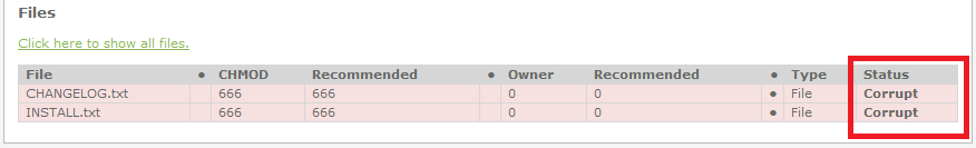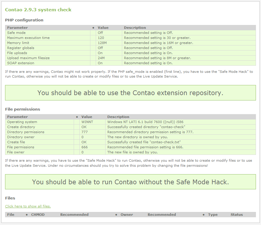 Die Verwendung des Tools ist sehr einfach: Nachdem es von der Contao Homepage heruntergeladen und entpackt wurde, kopiert man die in dem Ordner enthaltene Datei contao-check.php per FTP in das Root-Verzeichnis der Contao-Installation und ruft diese im Webbrowser auf. Daraufhin öffnet sich eine sehr lange Webseite. Zuerst klickt man auf dem unter Files plazierten Link Click here to show only warnings.