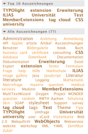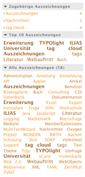 | 09:48, 27. Aug. 2010 | Tagcloud frontend.png (Datei) | 18 KB | Hschottm | 1 | ||